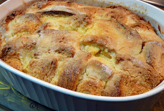 Sprinkle with some white sugar and place dish into a pan of hot water and bake in a 350 oven for 45 to 1 hour, or until pudding is set and golden.