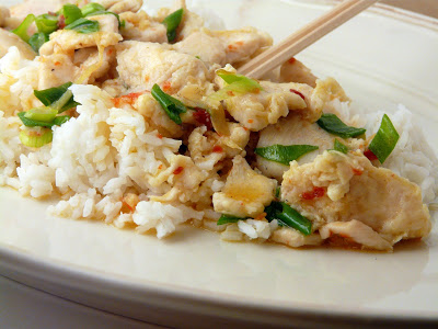 The chicken marinated for about 30 minutes and then was quickly sauted in a hot wok in peanut oil. The chicken was drained and set aside, the wok wiped clean and the sauce made by sauting the garlic and the ginger in a little peanut oil, adding the chili sauces, rice wine vingear and the chicken broth. Thicken slightly with a little cornstarch mixed with chicken broth. Simmered for a couple of minutes and then the chicken was added to the sauce to reheat. Tossed in some sliced green onions and served over rice.