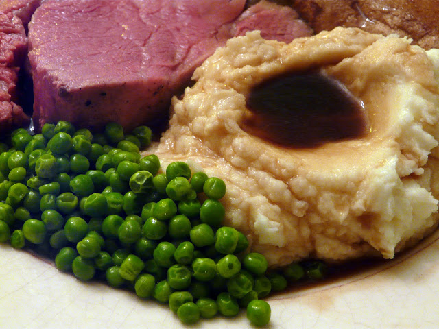 Served with mashed potatoes and buttered peas.
