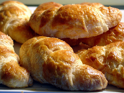 Baking the croissants: Arrange the oven racks to divide the oven into thirds, and preheat the oven to 350 f. Brush the croissants once again with egg wash and bake for 12 minutes. Rotate front to back and bake another 4 to 6 minutes, until the croissants are deeply bronzed. Cool on racks. As tempting as they are croissants should not be eaten as soon as they come from the oven. The dough-and the layers within need time to set.