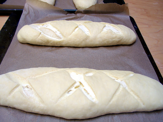 sheet and cut X’s in top. (About 6 X’s) (Danish should be slightly flatten, and about 3 1/2 to 4 inches wide and about 12 inches long.