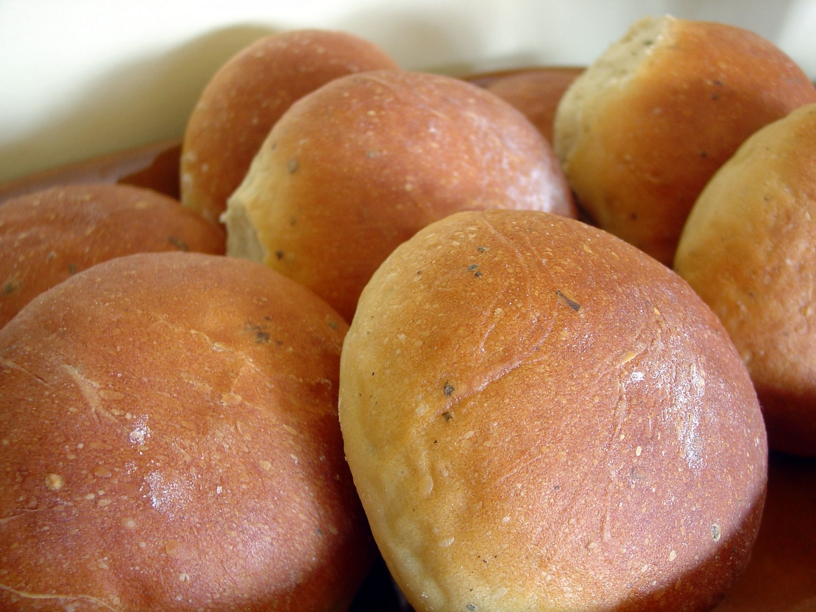 If you have a spritzer, spray the top of the rolls with water right before placing them in the oven. Place them in the center rack and bake them for 10 minutes. Rotate the pan 180 degrees and bake them for another 10 to 20 minutes, depending on size. My large hamburger bun sized rolls took close to half an hour to bake. You’ll know they are done when the bottom of the rolls is solid and slightly crispy. If you have a probe thermometer, check the temperature inside one of the rolls. When the internal temperature is approaching 200 degrees F, they are ready to pull out of the oven.