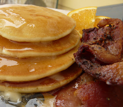 Made a big breakfast. Pancakes and Bacon (with black pepper).