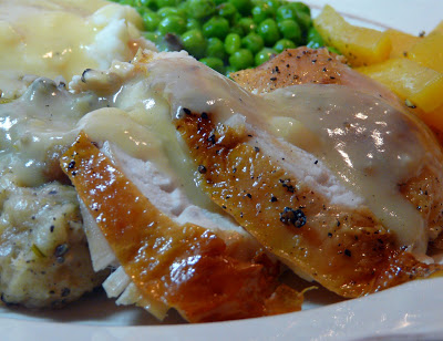 That is what Moe thinks I should call the traditional roast chicken dinner. Actually it takes 70 minutes if you let the bird rest for 20 minutes before slicing. Lots of time to bake a bread dressing, make gravy, mashed the potatoes and cook vegetables.