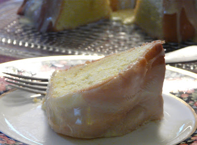 I baked a pound cake for dessert and drizzled it with a white chocolate ganache. The cake was actually the one that belongs with the Cassata cake that Lori from All That Splatters made last week. Rather than add lemon or an orange liqueur, I just scraped the seeds from a vanilla bean and added them to the batter.