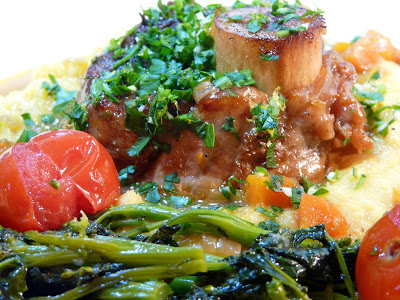Tonight we had Osso Bucco with Gremolata served over Polenta. I use chicken broth with minced garlic as the liquid for the polenta. Butter and Parmesan cheese are added at the end. Sauted Rapini on the side.