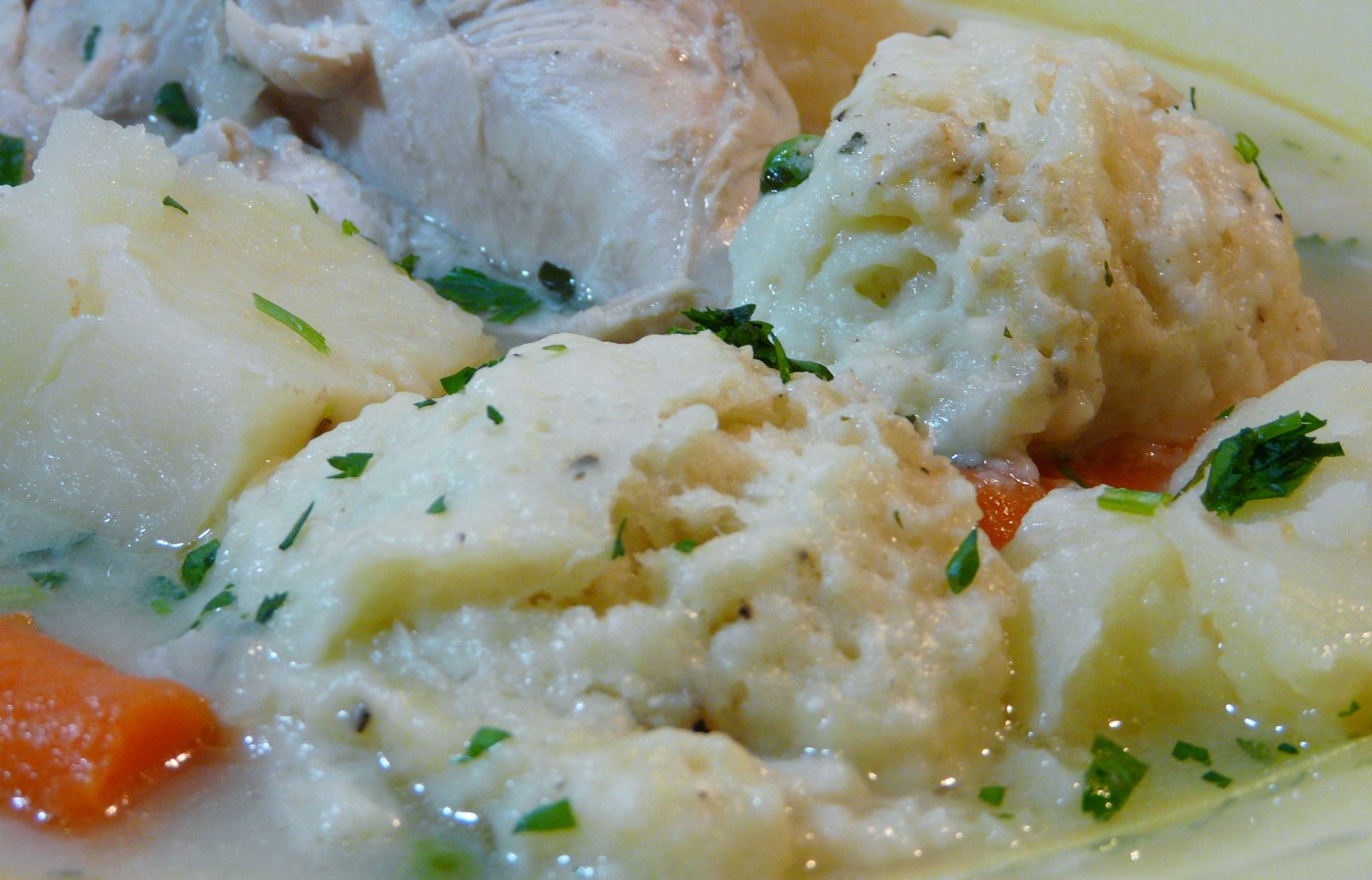 I presalted a chicken on Friday with the intention of roasting it for dinner last night. But at work yesterday, I kept thinking about chicken and dumplings. I had a real craving for a bowl of comfort. I had also bought some bone in chicken breasts on Friday, so, when I got home from work last night I threw a couple of them into a pot with some chicken broth, three or four whole small cooking onions, a couple of celery stalks cut into 2 inch pieces, a fresh bay leaf and some fresh thyme and simmered until almost tender. Added one carrot cut up, with a couple of quartered russet potatoes, and when they were almost done tossed in some frozen peas and added the dumplings to the pot. Fifteen minutes later dinner was served.