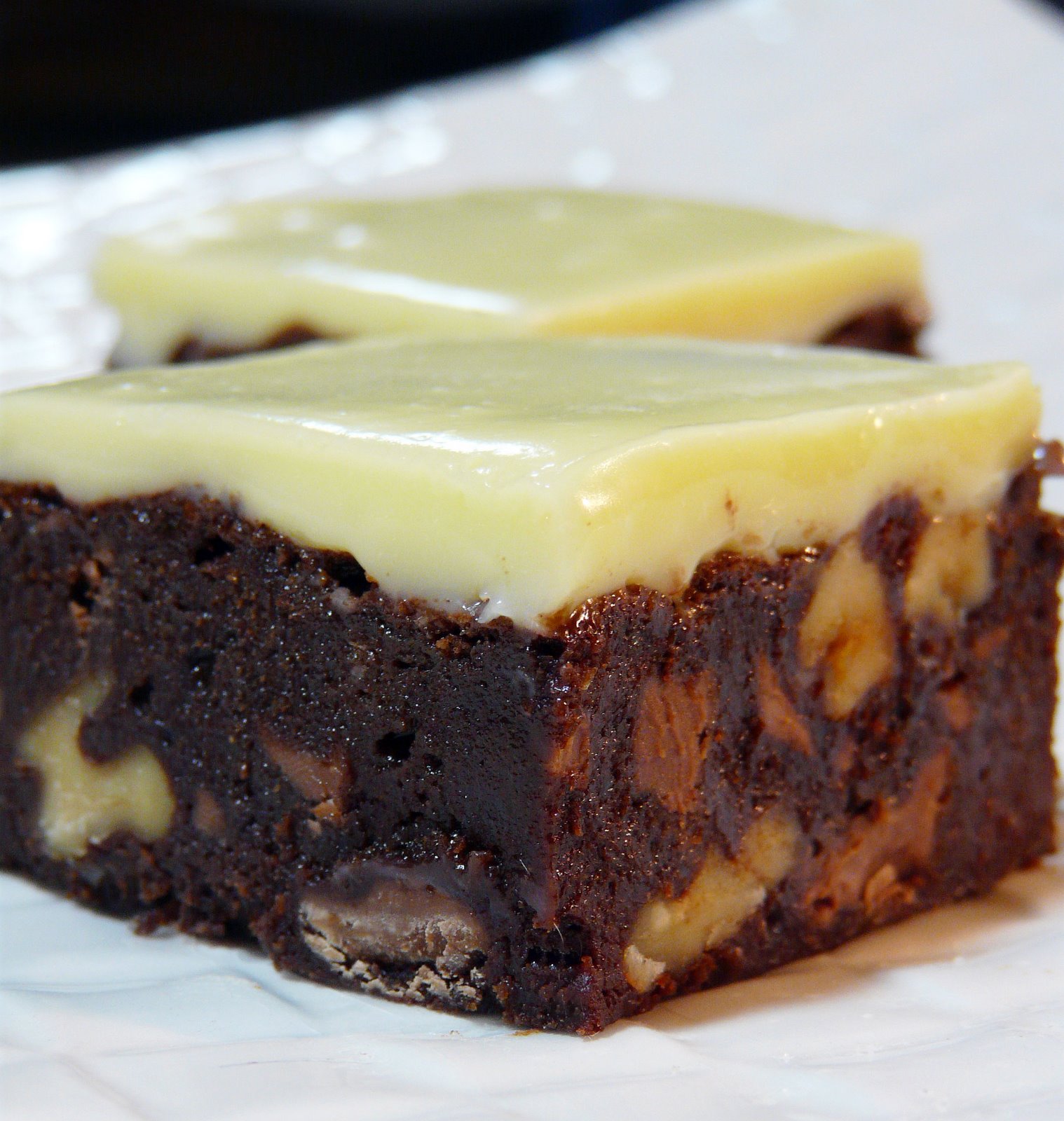 I saw a picture of a brownie on Tastespotting and Foodgawker that was topped with white chocolate. Apparently the recipe was one of Dorie Greenspan’s. I decided to make brownies tonight using my own Decadent Brownie recipe and just add even more chocolate. I chopped up about 6 ounces of Callebaut milk Chocolate and added it to the batter and also glazed the brownies with a white chocolate ganache. They were a big hit with Moe and our neighbours.