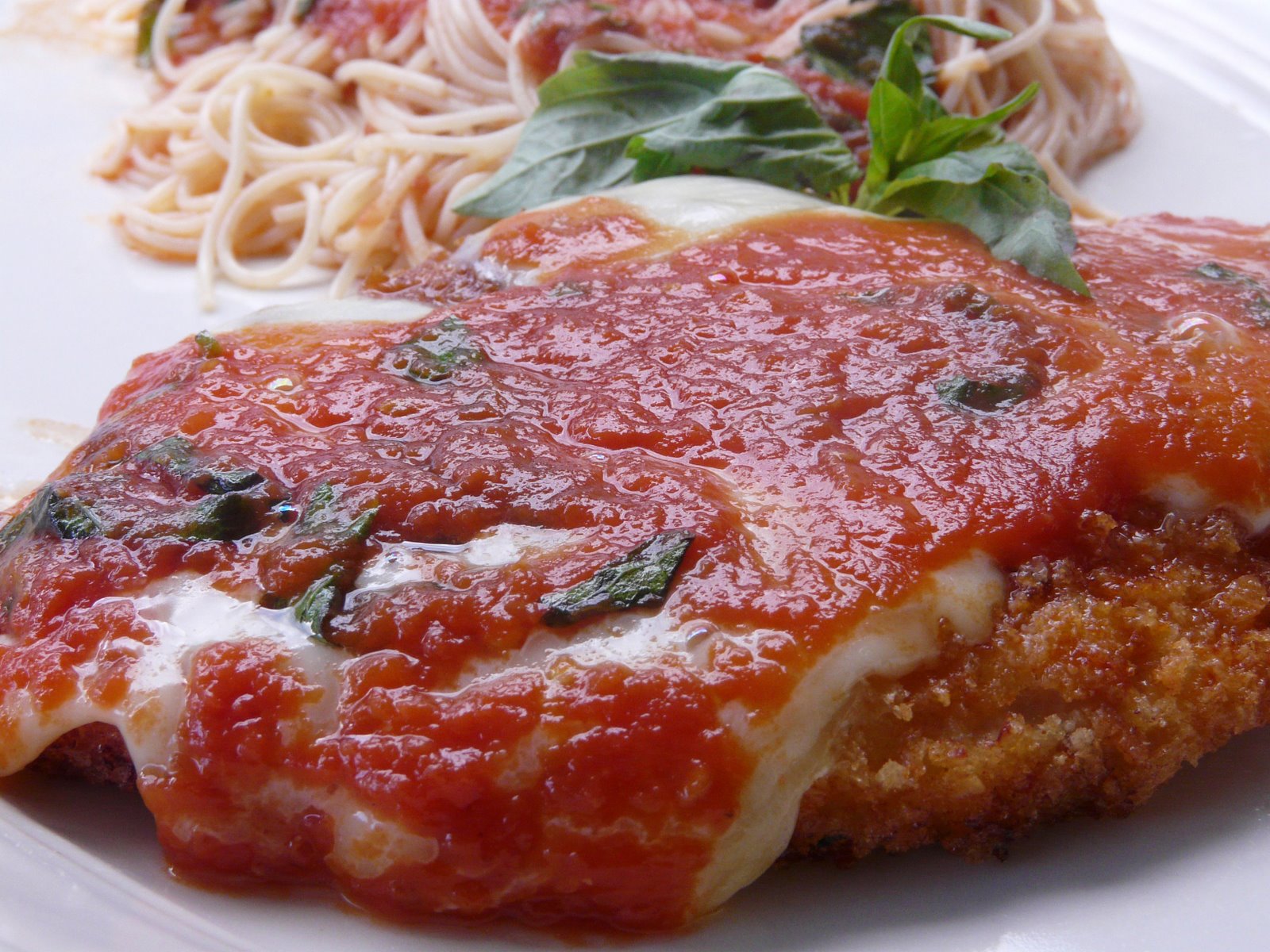 First thing I did was put the water on to boil for the pasta and the sauce on to simmer. Basically just a marinara sauce; olive oil, garlic, tomatoes, fresh basil, salt and pepper. While the sauce simmered I ground up some fresh bread crumbs, seasoned them with fresh grated Parmesan and a little lemon zest. Pounded the chicken breasts to flatten. Rubbed the chicken with fresh garlic, dipped in flour, egg and the breadcrumbs and fried. When the chicken was almost cooked, the pasta went into the pot. It was vermicelli so it didn’t take long to cook. Topped the chicken with mozzarella cheese and a little Parmesan and ran it under the broiler until the cheese melted, added the sauce to the pasta and a little on the chicken and dinner was served.