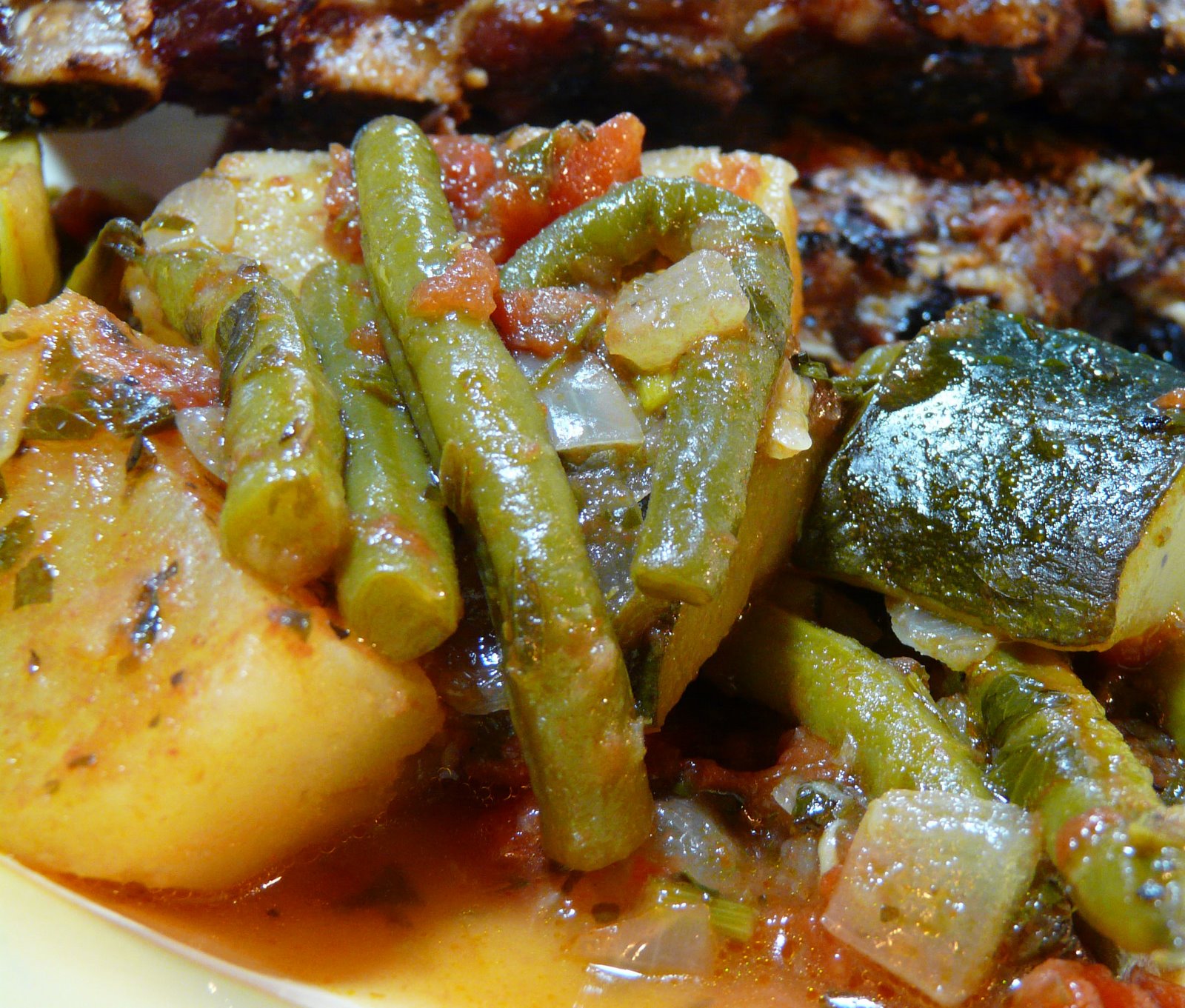 Green Bean, Zucchini and Potato Stew (Fassolakia Ladera)This is a traditional vegetable mixture that is often eaten cold, accompanied by hunks of country bread and feta cheese