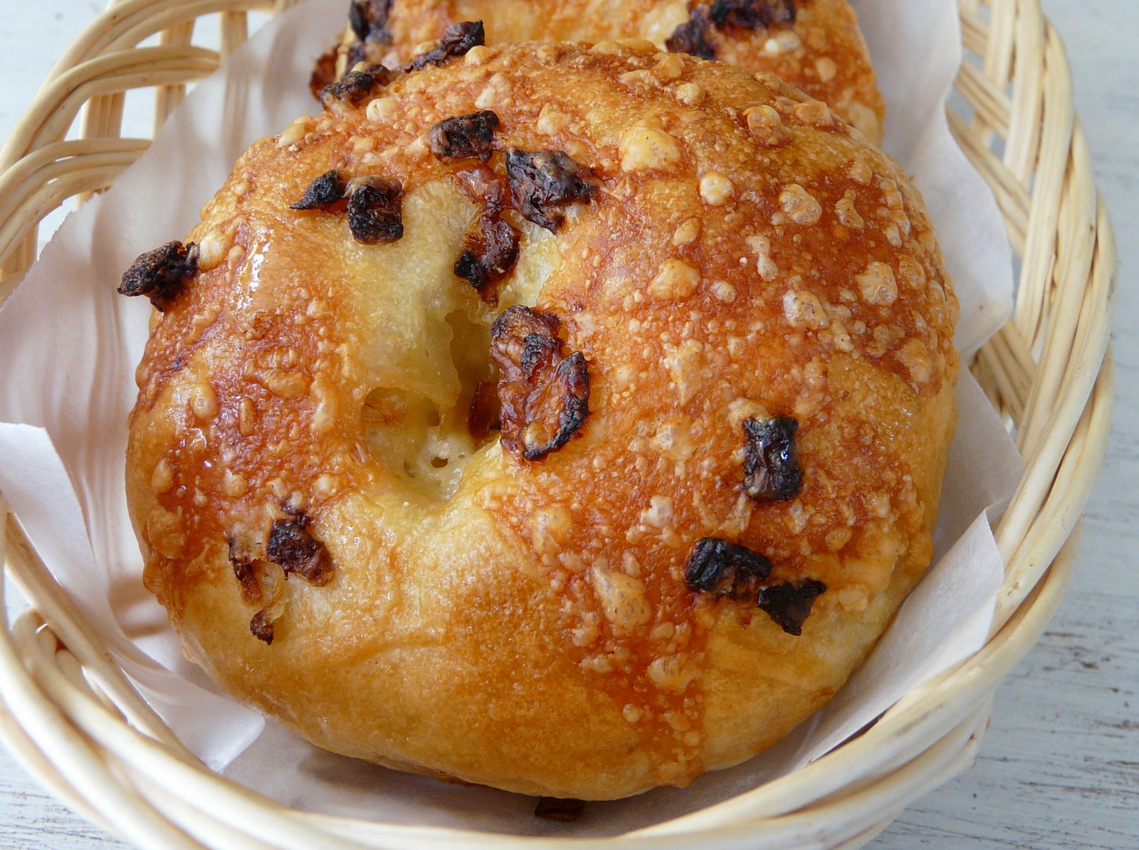 Usually I top the bagels with poppy seeds but this time I baked 12 plain and 6 with cheddar and onion . To make the cheese and onion I sauted onions in olive oil and spread some of the onions over the dough along with grated Balderson six year old white cheddar and then divided and shaped the dough. After the bagels were boiled, they were brushed with an egg wash and topped with more onions and cheddar. TIP: If you don’t like your onions really dark and crispy, wait until the bagels are half baked before topping with the onions.