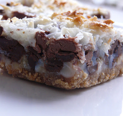 Sprinkle chocolate chips over the crust, then the walnuts and then the coconut. Drizzle the condensed milk evenly over the top. Bake for about 25 minutes until the coconut is lightly brown. Cool and then cut into squares.