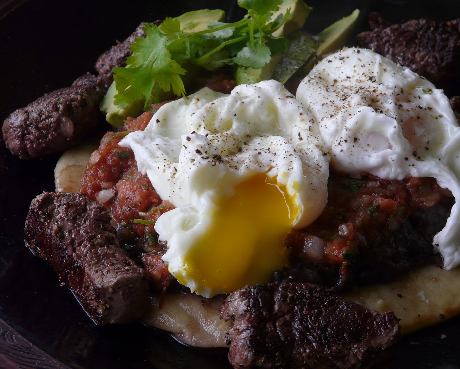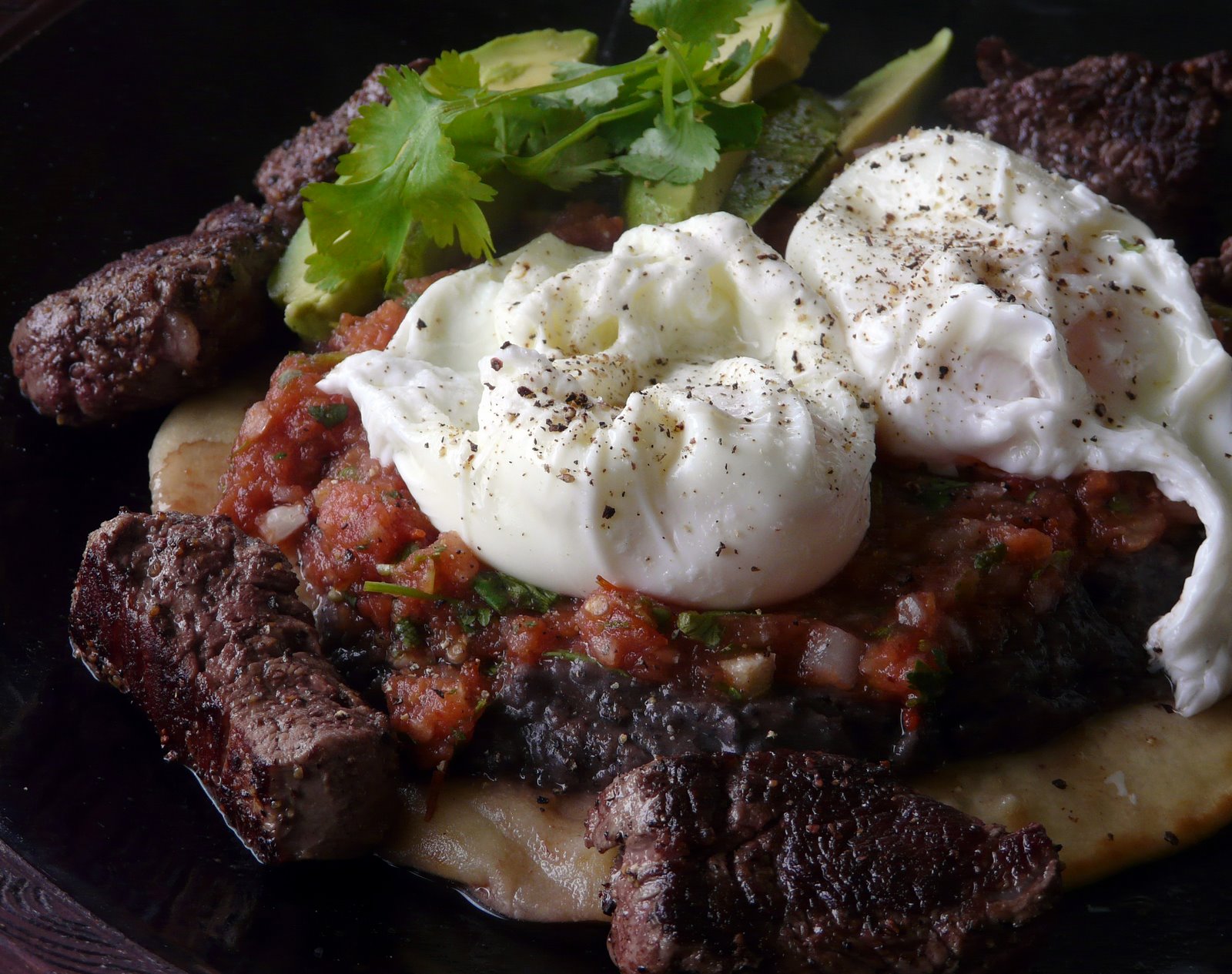 I had black beans and salsa and flour tortillas leftover from last night’s Cinco de Mayo dinner. So rather than toss them out I made Moe a man size breakfast. Steak and Eggs Mexican style. I took what I thought were two packages of stewing beef out of the freezer last night and one of them turned out to be beef tenderloin tips. So along with the beef, cooked rare, I fried a flour tortilla, topped it with refried pinto beans, warmed up salsa and a couple of poached eggs. Judging from the moans I was hearing from Moe, I know this was a major hit.