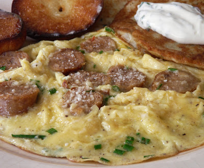I have the next three days off so Moe will be eating better. Starting this morning with a Chorizo and chive frittata sprinkled with fresh grated Parmesan cheese and served with potato pancakes and homemade bagels, toasted.