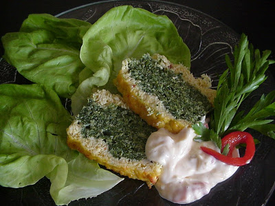 To serve, run a knife around the edge and invert on to a serving platter. Slice about 1/2 thick slices and place two on each plate. Decorate plate with a lettuce leaf and place a dollop of the sauce on the lettuce leaf. Garnish with a few chives.