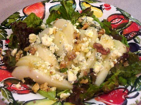 Make candied spiced walnuts and Zinfandel dressing first. After the pears have been