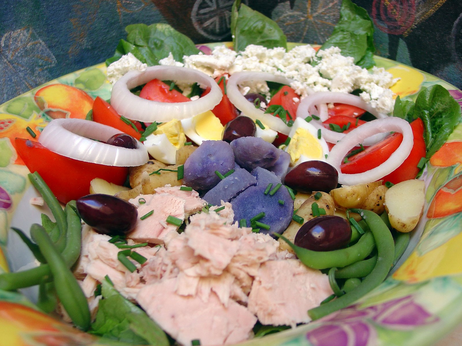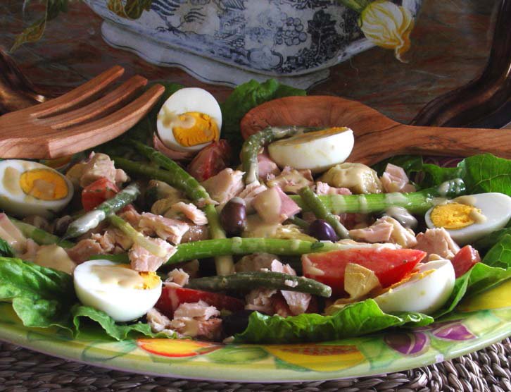 Separate romaine heart leaves and arrange on platter. Arrange hard boiled eggs cut into quarters, green beans, tomatoes, potatoes and olives decoratively over lettuce leaves. Add the anchovies and onion rings. Break up tuna and arrange over vegetables. Drizzle with dressing.