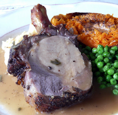 Moe was not feeling well on Friday so I made him a pot of potato leek soup and Saturday night we had a pork dinner. I presalted a small rack of pork Thursday night and covered it in plastic wrap. I unwrapped it Friday night so that it could air dry and before work Saturday, I rubbed it generously with fresh garlic, sage and lots of black pepper. Moe put it in a 375°F oven shortly before I got home from work so I just had to prepare the sides. Served it with mashed potatoes, buttered peas, a baked sweet potato and of course lots of gravy.