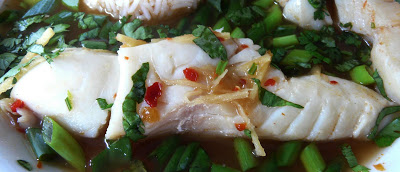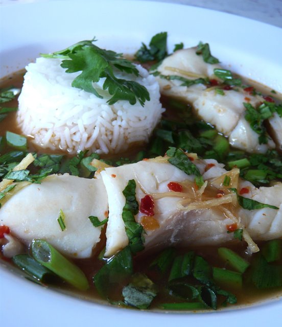 Heat chicken broth. Add chili garlic sauce, minced garlic, ginger, and rice wine vinegar. Bring to a low simmer. Add halibut, cover and poach for approximate 5 to 6 minutes. Turn off heat and let sit one to two minutes. Serve in shallow bowls. Sprinkle with green onion and cilantro. May be served with either rice or rice noodles.