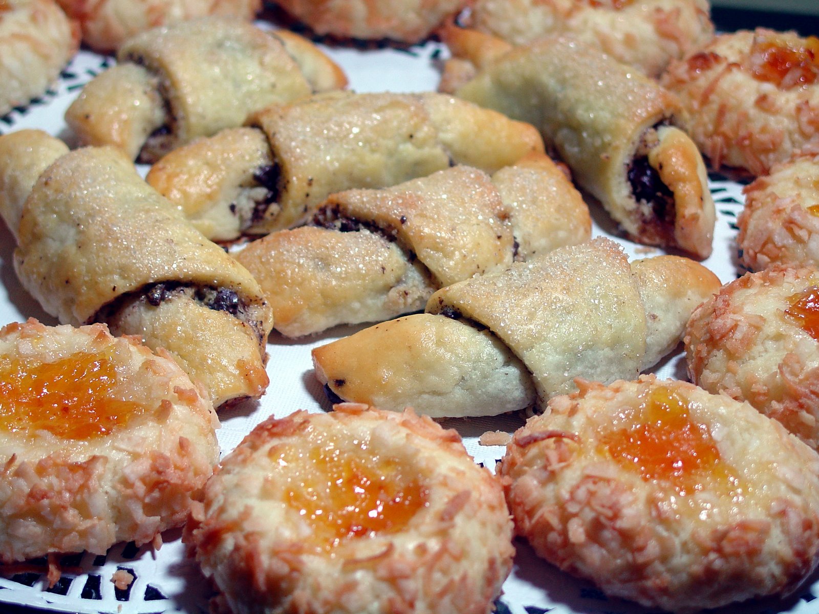 To make the filling, combine 6 tablespoons of granulated sugar, the brown sugar, 1/2 teaspoon cinnamon, the raisins, and walnuts. On a well-floured board, roll each ball of dough into a 9-inch circle. Spread the dough with 2 tablespoons apricot preserves and sprinkle with 1/2 cup of the filling. Press the filling lightly into the dough. Cut the circle into 12 equal wedges—cutting the whole circle in quarters, then each quarter into thirds. Starting with the wide edge, roll up each wedge. Place the cookies, points tucked under, on a baking sheet lined with parchment paper.