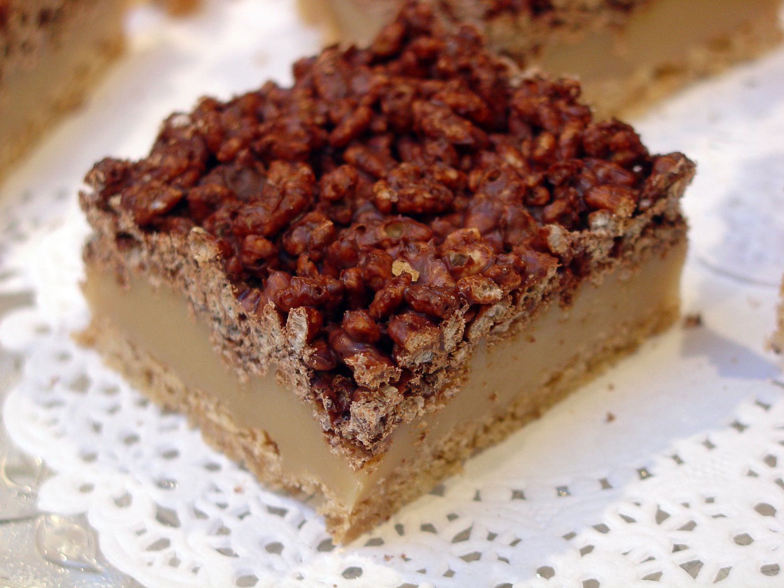 Melt chocolate chips and stir in the 1 1/4 cups of rice krispies. Stir to coat well. Use two forks to spread evenly over the toffee layer. Chill and cut into squares.