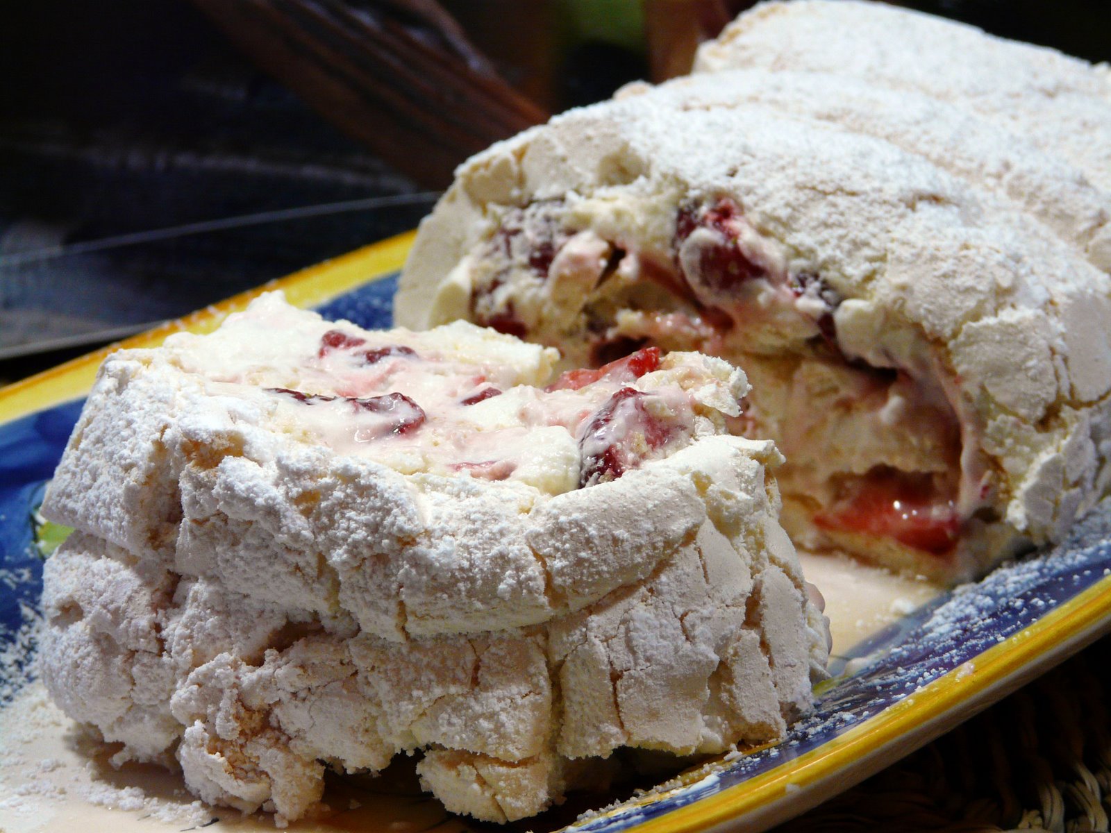 Spread with whipped cream, sprinkle sliced strawberries over the surface and roll. Don’t worry if the meringue starts to crack a little. Just keep rolling. Transfer to a platter and sprinkle with powdered sugar.