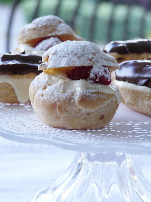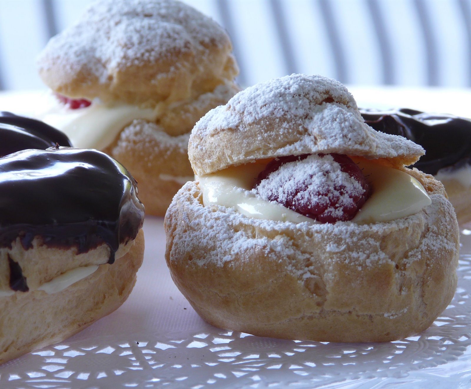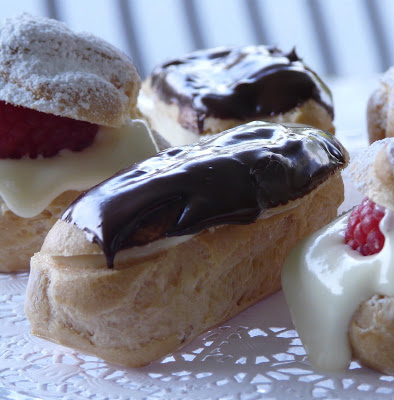 For dessert we had chocolate éclairs filled with a white chocolate pastry cream, and little cream puffs with the same filling but with raspberries, dusted with powdered sugar.