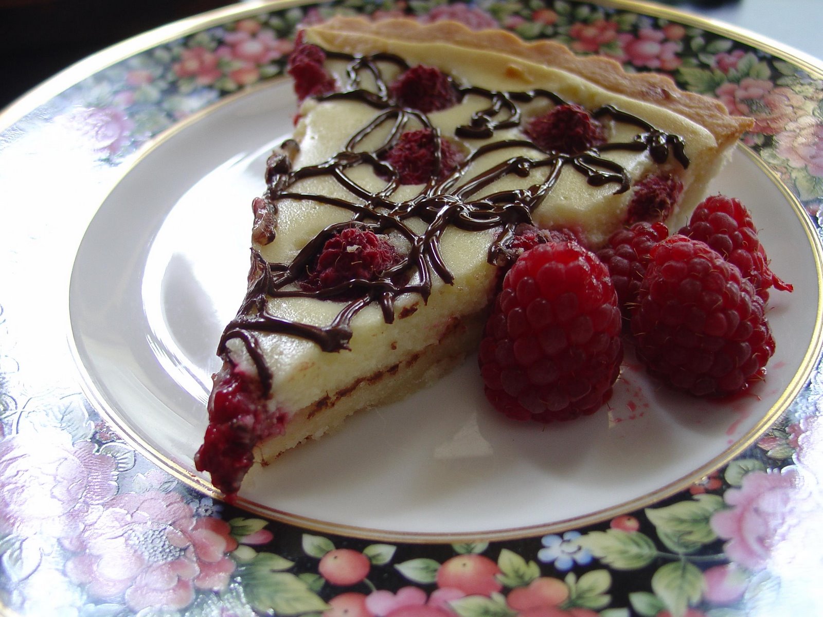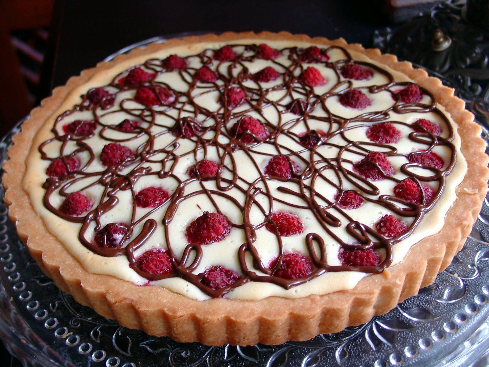 Beat the cream cheese with sugar until soft and creamy. Add the eggs and continue to beat. Beat in melted white chocolate, cream and vanilla. Decorate tart shell with raspberries. Slowly pour the cream cheese filling around the berries. Bake for approximately 25 to 30 minutes or until the filling is set. Let cool on rack. May be decorated with melted chocolate.