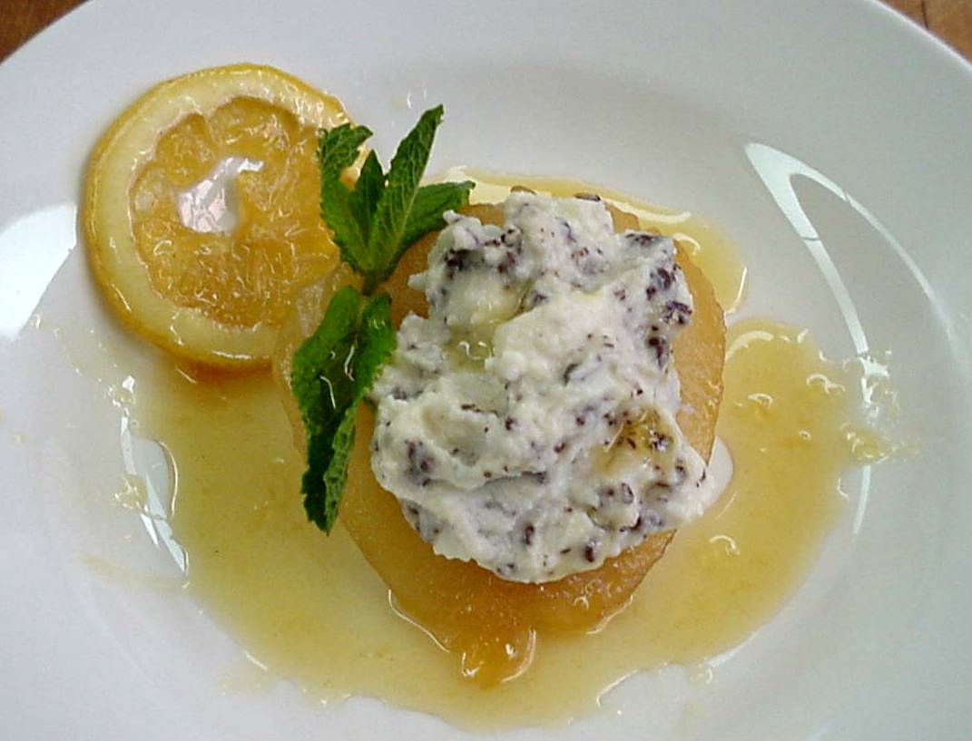 To serve, place a pear half, cut side up, on each plate. Spoon about 1 tablespoon (15 mL) cheese mixture on to each half. Drizzle pear and plate with any syrup remaining in frypan. Arrange a cool lemon slice on each and dust with icing sugar.