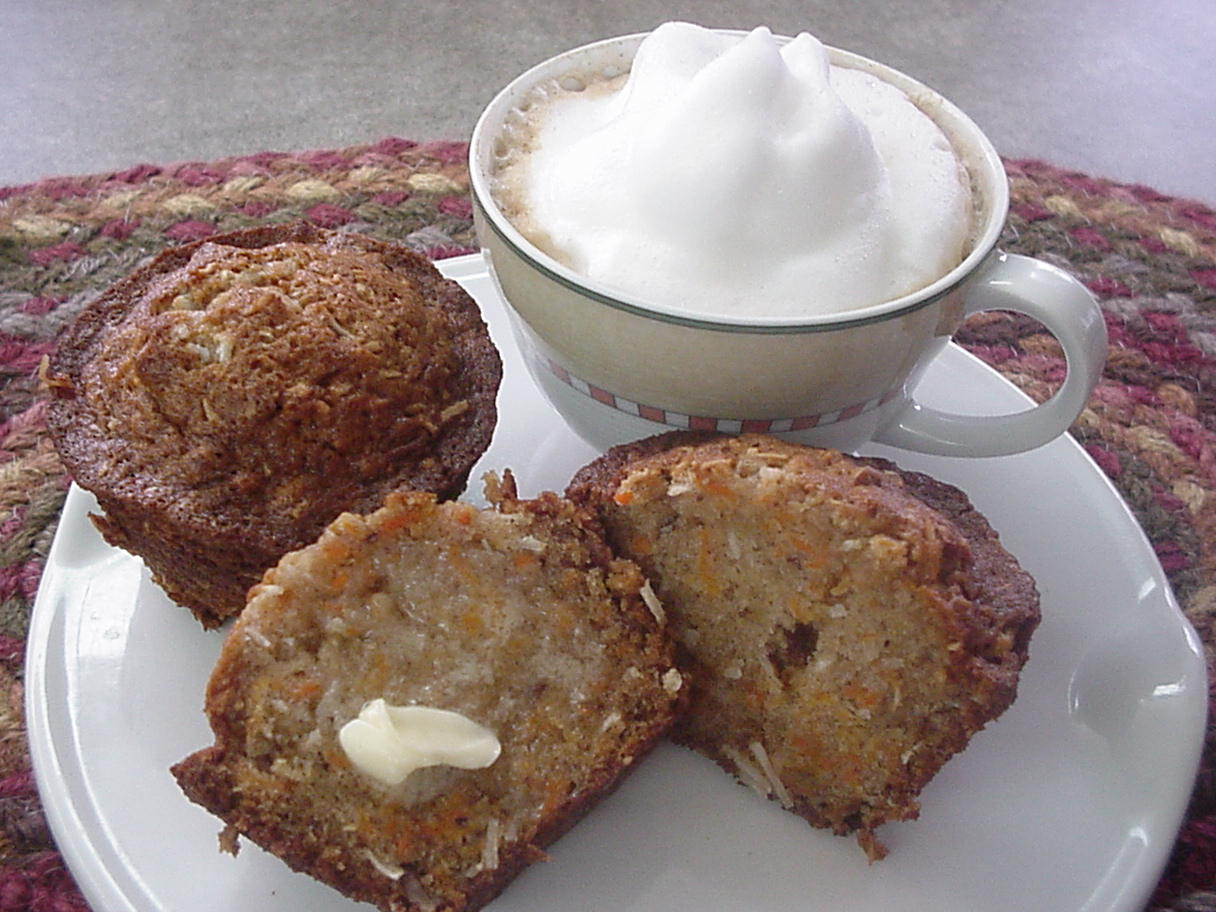 Preheat oven to 350 F and oil eighteen 1/2 cup muffin tins. In a large bowl sift together flour, baking soda, cinnamon and salt and whisk in sugar. Coarsely grate enough carrots to measure 2 cups and chop pecans. Add grated carrots and pecans to flour mixture with coconut and toss