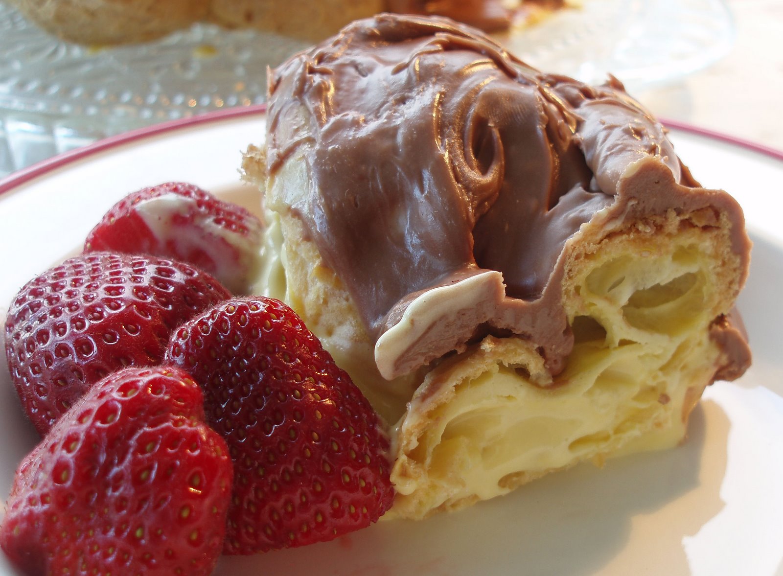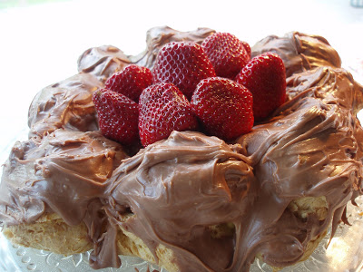 If making the large ring, cut top off ring, and remove extra soft interior, leaving a hollow shell. Fill with cream filling and replace top. Decorate with Chocolate Glaze and add fresh strawberries to the centre of the ring.