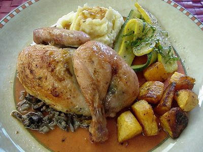 Make stock using the carcass. In a small saucepan, saute onions in a small nut of butter. Add thyme, garlic, parsley and bay leaf. Saute a few minutes and add chicken and hen bones. Continue sauteing. Add about 2 1/2 cups of water or chicken stock salt and pepper. Bring to a boil and simmer about 60 minutes. Strain.