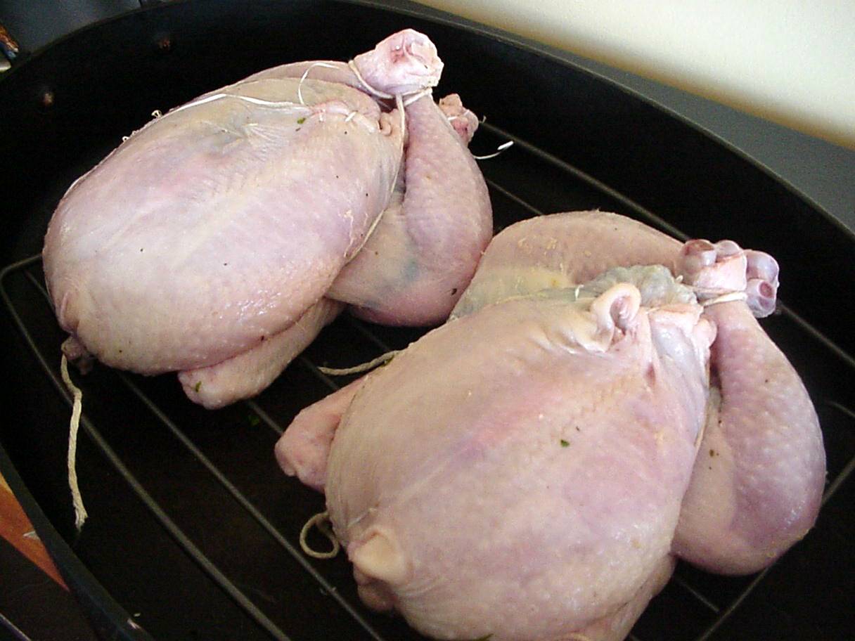 Roast birds in a 375°F until done, about 45 minutes. Remove birds from pan.