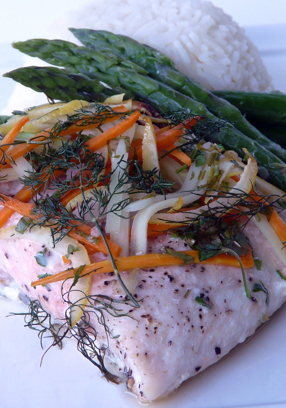 To serve. Place a piece of salmon on plate keeping some of the julienne