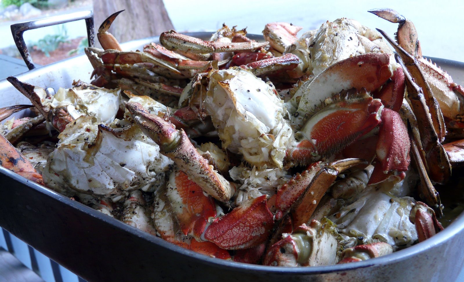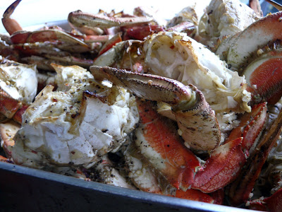 8 large dungeness crabs. Fresh crab trumps roast pork. They gave me the crab to prepare. There must have been between 14 and 16 pounds of crab. I weighed a couple of them and one was 2 pounds 11 ounces and another was 1 pound 12 ounces. I par boiled them and then cleaned them. And, then they went into a 500°F with a cup of butter, 1/2 cup olive oil, 2 heads of garlic, chopped, lots and lots of fresh ground black pepper and about a 1/2 teaspoon of hot red pepper flakes. Roasted for about 15 minutes , tossing them in the butter garlic mixture every 5 minutes. I carried the roasting pan over to Clif and Barbs. Just before serving sprinkled with fresh chopped parsley and squeezed a lemon over it. OMG it was soooo good. And so messy to eat. We didn’t finish it all but we made a big dent in it.