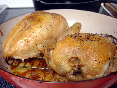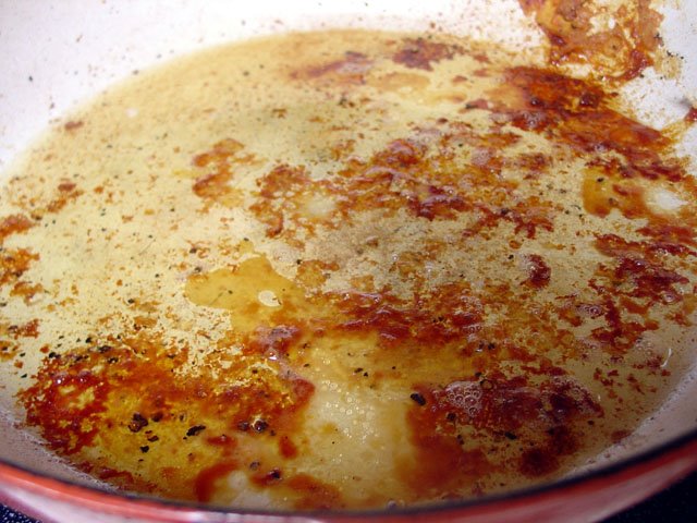 Remove chicken to a platter and while it rests make the gravy. There should be 3 or 4 tablespoons of chicken fat in the pan along with the wonderful brown bits. If there isn’t enough fat, add a little oil or butter to the pan.