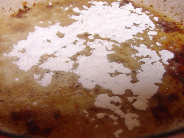 Now you want to make a roux. Add flour to the pan. The amount of flour added will depend on how much fat is in the pan.