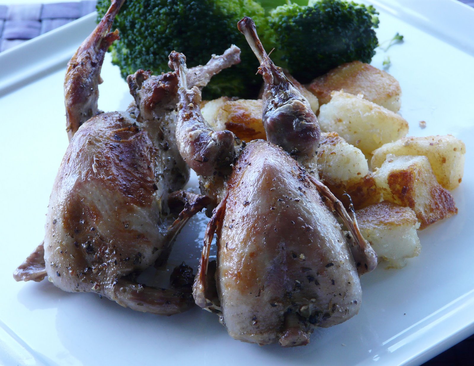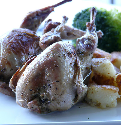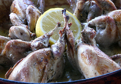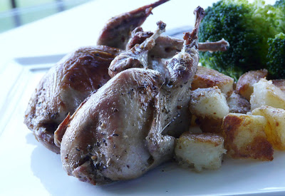 Moe loves Quail. Not something I cook very often. I roasted six of the little guys tonight. They were first marinated with garlic, olive oil, fresh thyme, and oregano, salt, pepper and the juice of a whole lemon and then stuffed with soft goat cheese that I seasoned with fresh garlic, rosemary, salt and pepper. Roasted in a 475°F oven for about 20 minutes, basting every 5 minutes with a little butter and chicken broth.