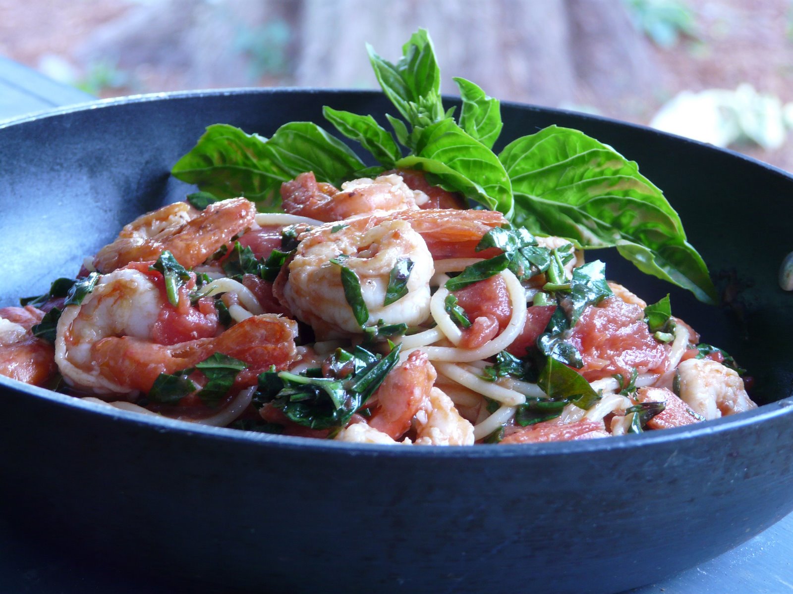 Dinner was quick to put together. I put a pot of water on to boil for the pasta and while the spaghetti cooked I heated olive oil over high heat and quickly sauted the prawns sprinkled with hot red pepper flakes. Removed the prawns and set aside. Added a little more olive oil to the pan, two cloves of minced garlic and a small can of quality Italian tomatoes, broken up, (I used my fingers) and a splash of chicken broth. Seasoned with salt and pepper. Simmered for a few minutes while the spaghetti was still cooking. Drained the spaghetti , I tossed the prawns back into the sauce, added the spaghetti, threw in a big handful of chopped fresh basil (from my garden) tossed and served.