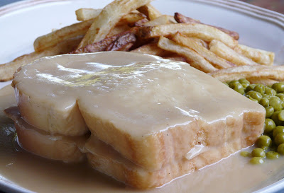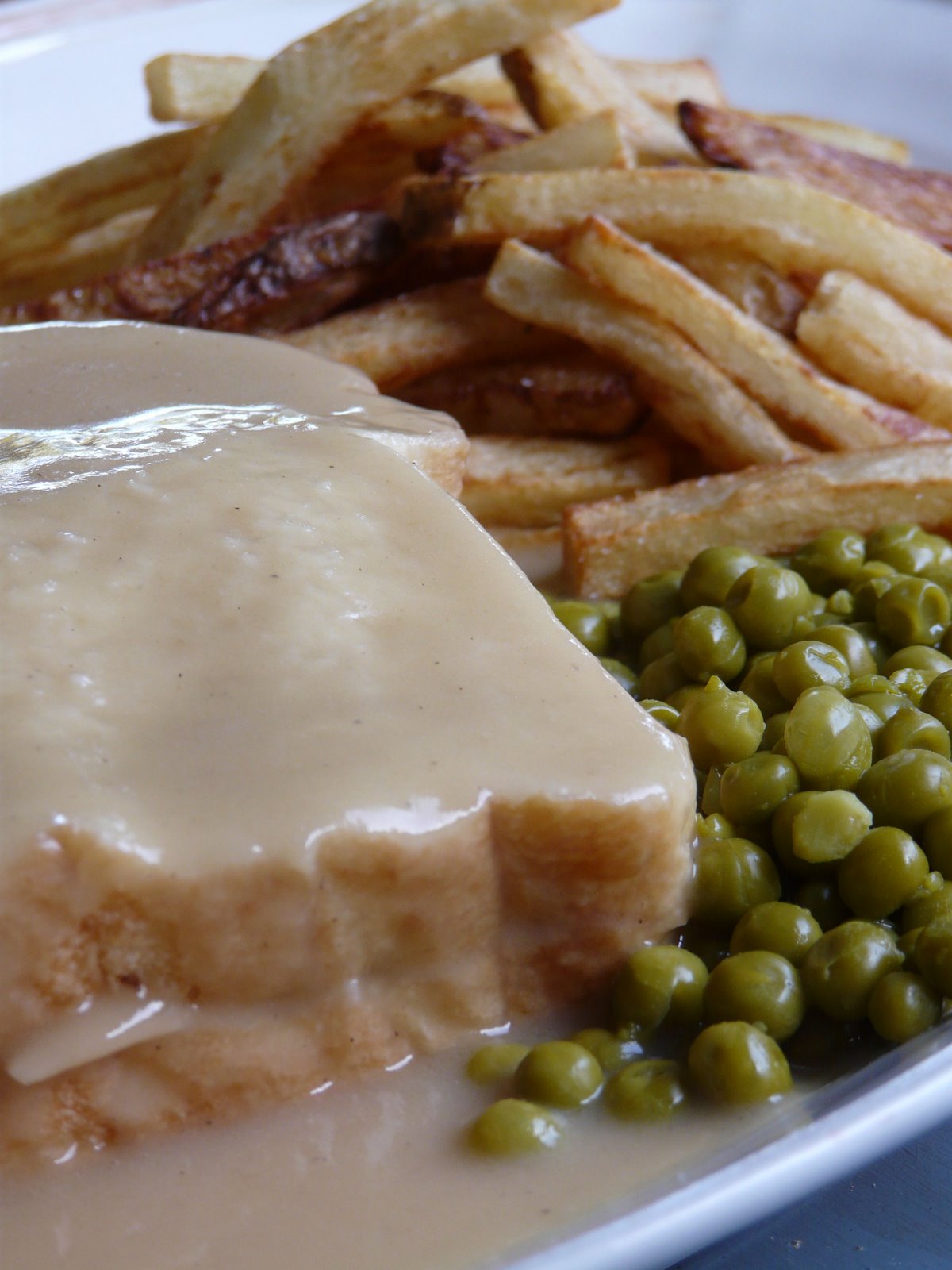 a food diary and some favourite meals will show up on a regular or semi-regular basis. I don’t always make this dinner from leftovers either. I roasted a whole chicken specifically to make hot chicken sandwiches. And it is always served with the same sides. Homemade fries and canned peas. I know, I know canned peas,what is she thinking. LOL! But hey, it is a tradition. A hot chicken/turkey sandwich just wouldn’t be the same without canned peas.