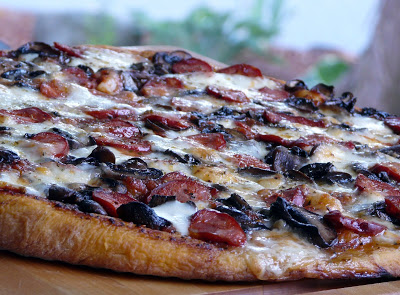 Early Wednesday morning I took the second half of the dough out of the fridge and left it to come to room temperature. Again plans were changed when we had to go out. The dough had been out for almost two hours and was almost ready to work with when I put it back into the fridge. We didn’t get home until about 4:00. I had no plans for dinner so I decided to take the dough out of the fridge again and use it to make a pizza for dinner. Once again it was left to come to room temperature . There was enough dough for a large pizza and a loaf of bread.