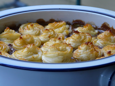 Shepherd's pie is one of my all time favorites! YUMI am quite envious of your piped potatoes. I tried making duchess potatoes a while back and made a terrible glop of them. May I ask what sized tip you used? Do you rice the potatoes first?