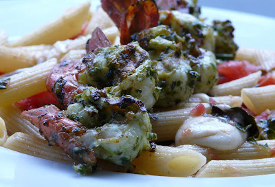 The penne was tossed with a fresh tomato sauce seasoned with lots of garlic and fresh basil. The prawns were rubbed with a lemon parmesan pesto and grilled. I tossed a few balls of mini boccochini cheese (fresh mozzarella) into the hot pasta before adding the room temperature tomato mixture. The heat from the pasta slightly melted the cheese. Moe moaned as he ate his dinner.
