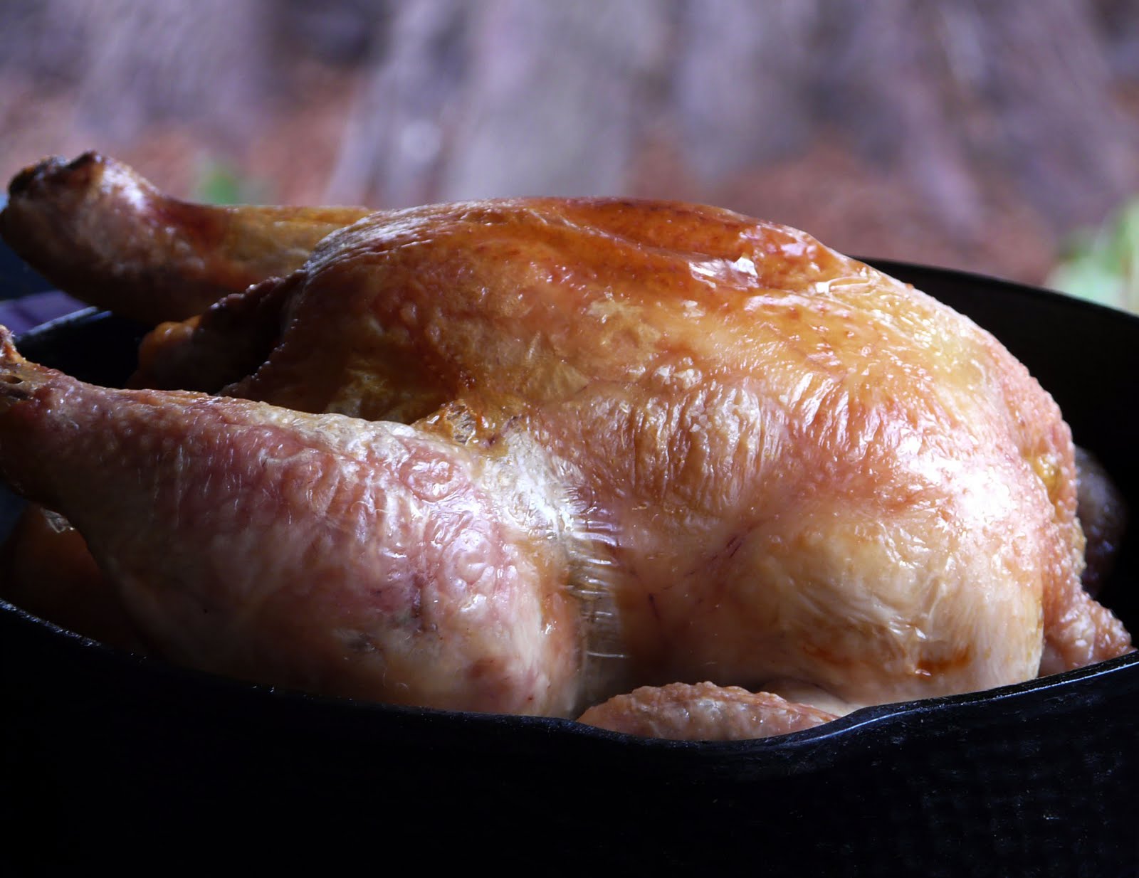 TIP: Use a pan that is just big enough for your chicken or turkey. This will reduce the amount of fat that gets splattered on the oven walls, reducing smoke and preventing smoke alarms from going off. I use a vintage Griswold #8 cast iron skillet. The perfect size for a small four pound bird.