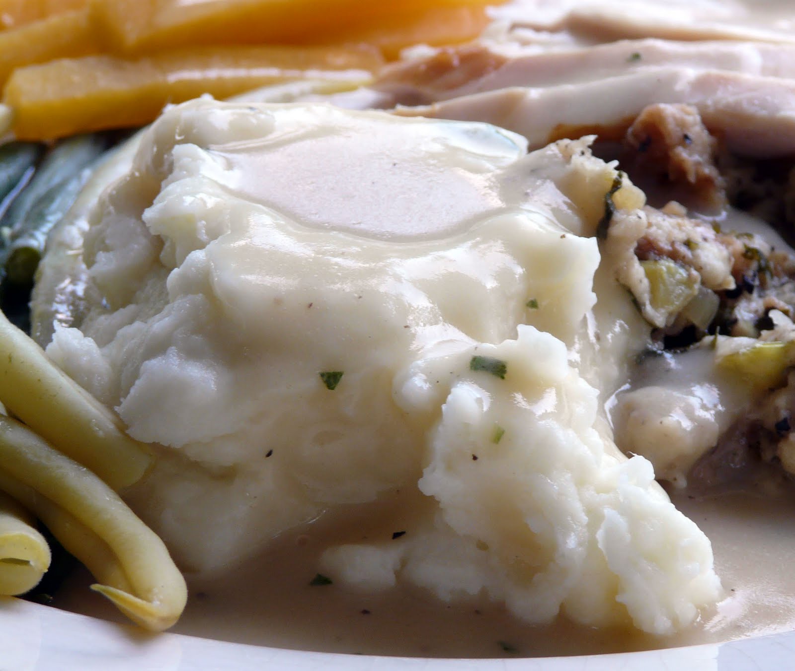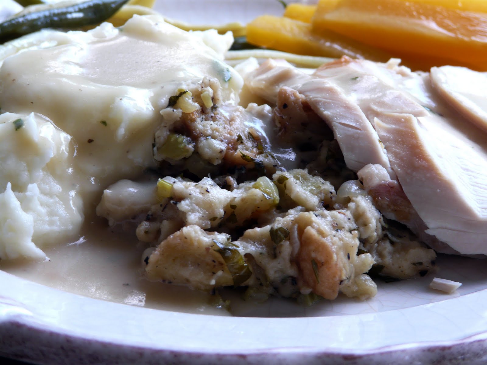Sides were mashed potatoes and gravy, steamed green and yellow beans and rutabaga. I also made a bread stuffing/dressing. (Moe feels deprived if I don’t make the stuffing). Because it was so hot yest
