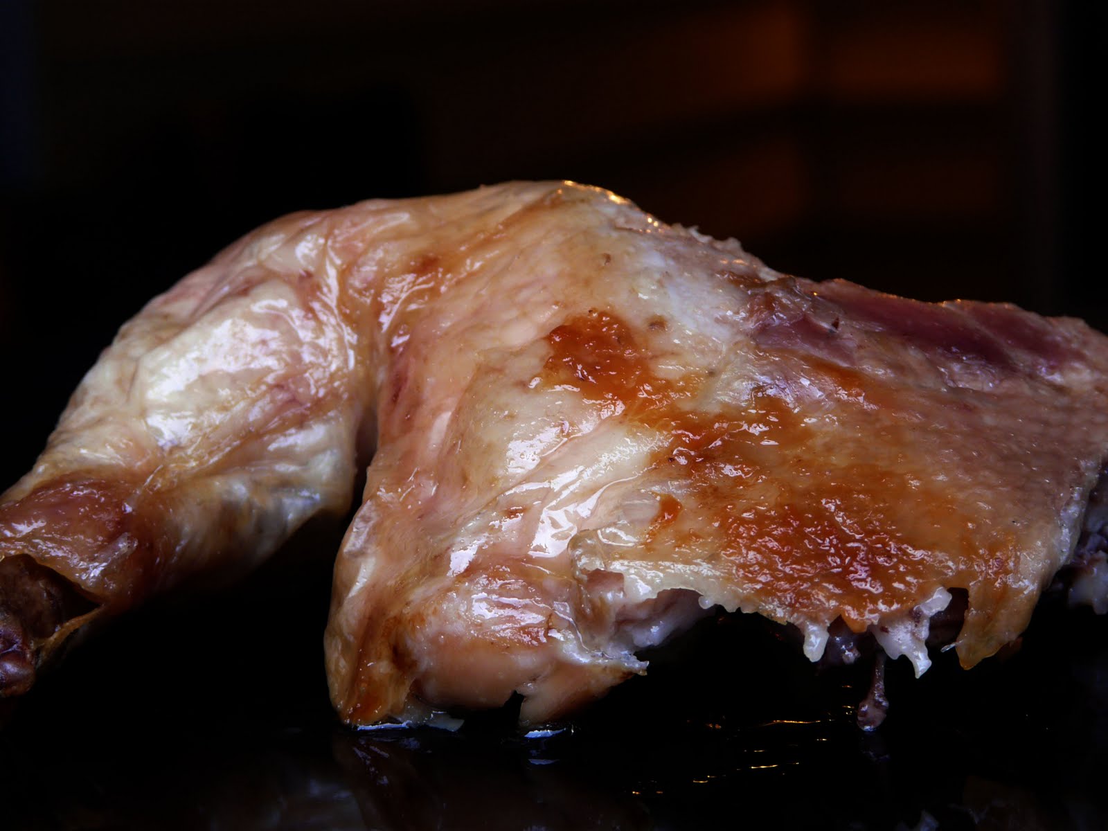 I presalted the chicken Tuesday night and covered with plastic wrap. The chicken was uncovered Thursday morning and left to air dry all day. Moe took the chicken out of the fridge about an hour before I got home from work. As always, I roasted the chicken using Barbara Kafka’s high heat method (500°F).
