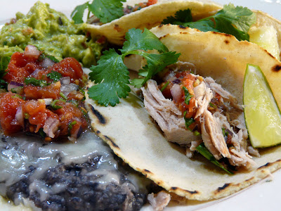 Spread a little of the refried beans on the tortilla, top with shredded pork, cheese, salsa, guacamole, lettuce, tomatoes, etc.. and enjoy.