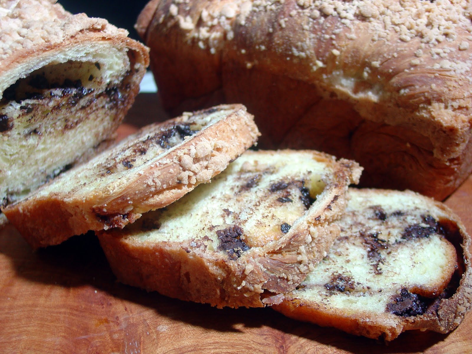 I processed the chocolate just a little to break it up, added some butter and some powdered sugar and spread it over the dough. Then I rolled it up and then twisted it before putting it in the buttered loaf pan. Sprinkled the top with a little struesel topping. Mixed a little butter, flour and sugar together for the struesel. I didn’t measure anything thing.