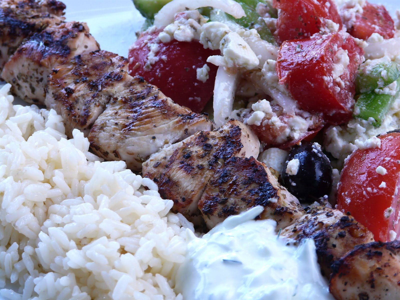 We had dinner with our neighbours – Clif and Barb – last night. This dinner of Chicken Souvlaki served with rice and a Greek salad is one of the easiest and quickest dinners to put together after a long day at work.