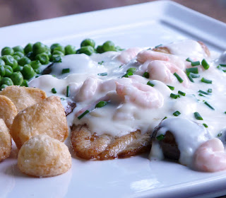 Fish again tonight. Sole served in a cream sauce with mushrooms and hand-peeled baby shrimp.